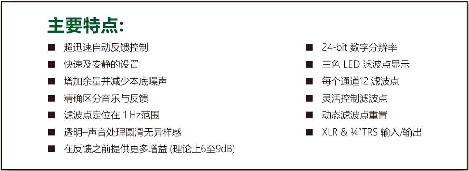 FBX 在众多反馈抑制器中脱颖而出取决于它在项目中控制反馈的能力,不单单只是设置的时间如果在演出至关重要的时刻发生了反馈或当工作人员开始系统布局时,FBX 滤波点将自动抑制所定位的反馈,不需要在工作中通过人为的方式去做处理FBX 同时也作为一台先进的自动参数滤波器.如果你有时间,有滤波器,有测试设备,你可以找出反馈的频点,更精确的滤波器定位,并制定出非常狭窄的滤波点,完全移除不需要的音色FBX将为你全面自动化,快速且超越其他一切方式它是怎么做到的?首先让我们想一想一台优质的反馈抑制器应该如何去体现自身价值.例如可以通过表现似门的速度,精准,分辨率和声波完整性.