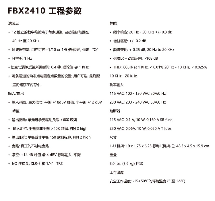 高水准全自动反馈控制器FBX2410依旧延续着Clearone业内领先的神话。集创新与高效于一身的反馈抑制器.同时也不断改进规格和音频性能,FBX 反馈抑制器美国制造.联系我们或离你地区最近的Clearone经销商去尝试这款全新的FBX吧.你将会得到高音质的享受!