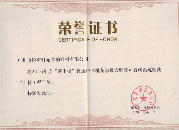 河源桃花水母大剧院荣誉证书