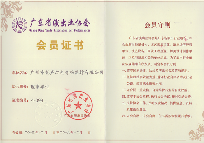 广东省演出业协会会员证书理事单位