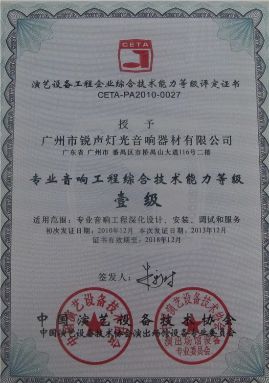 专业音响工程综合技术能力壹级