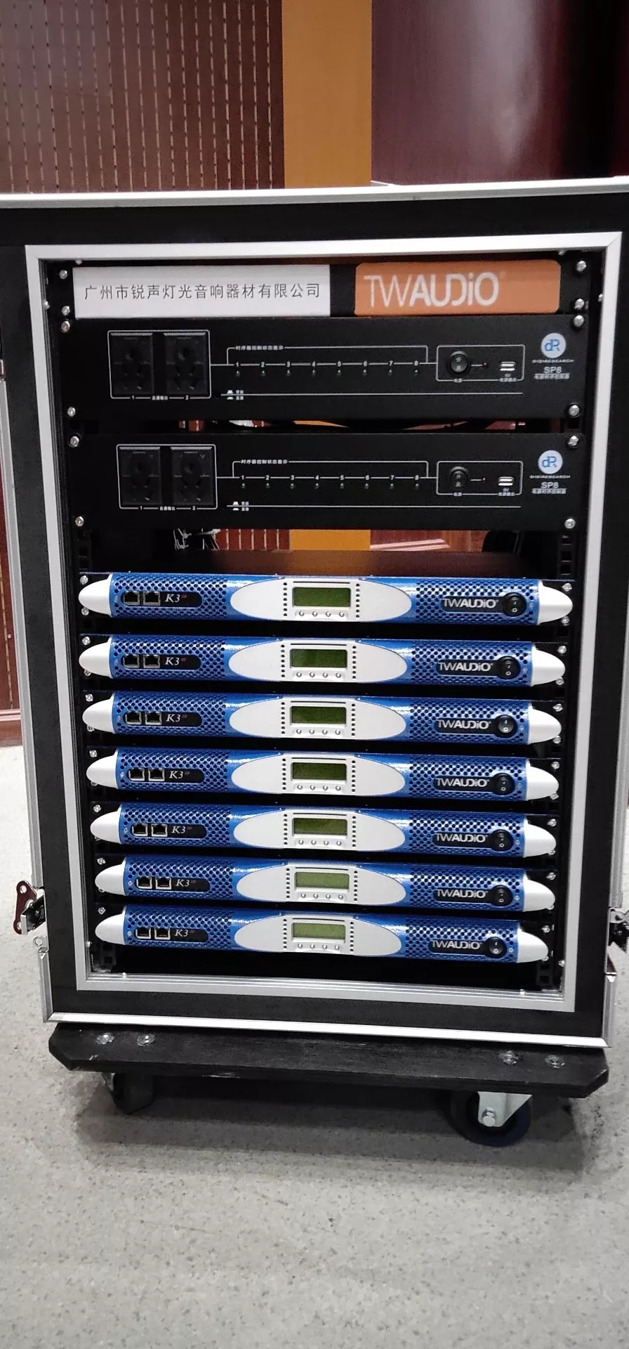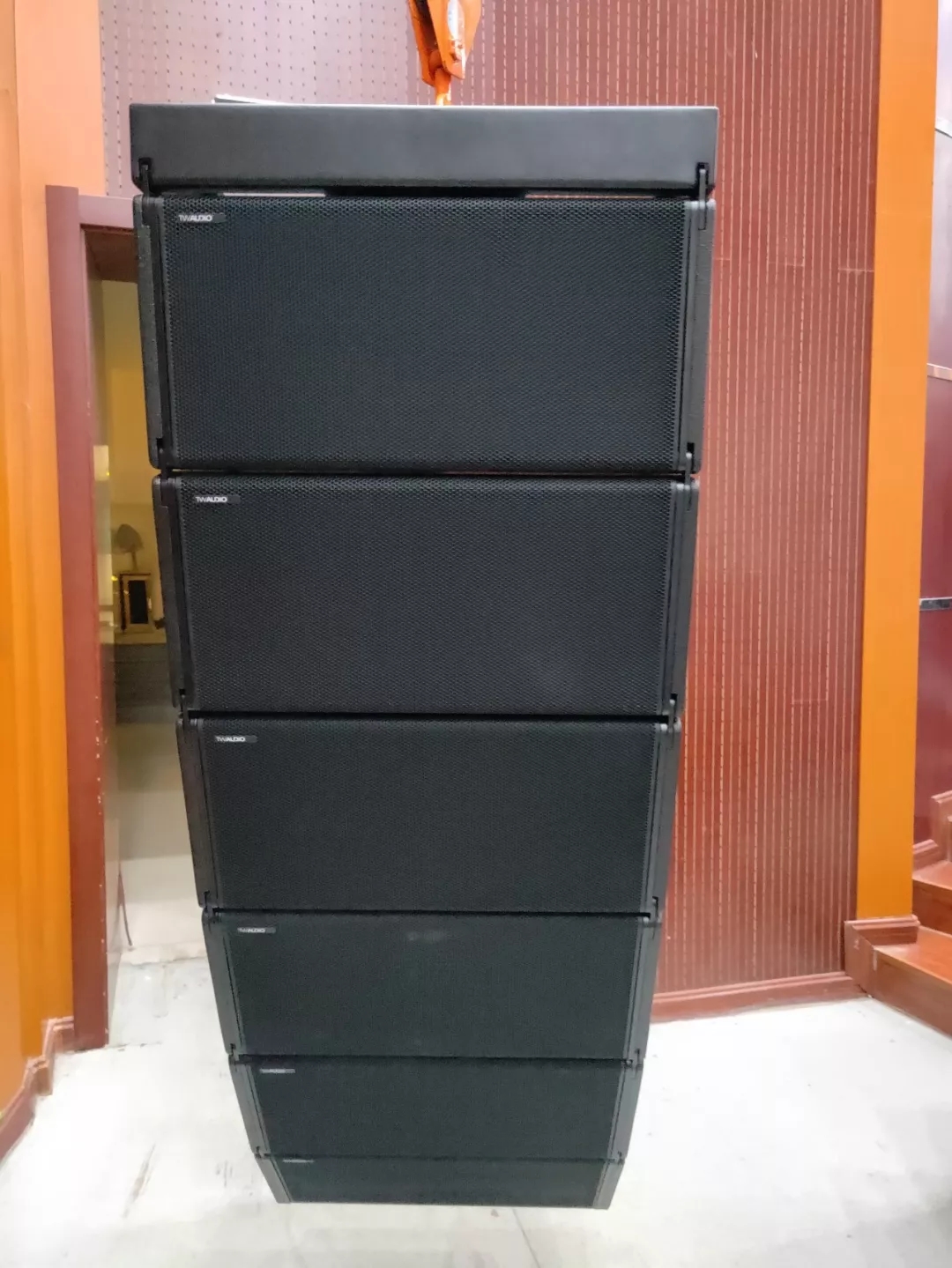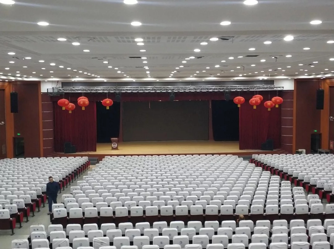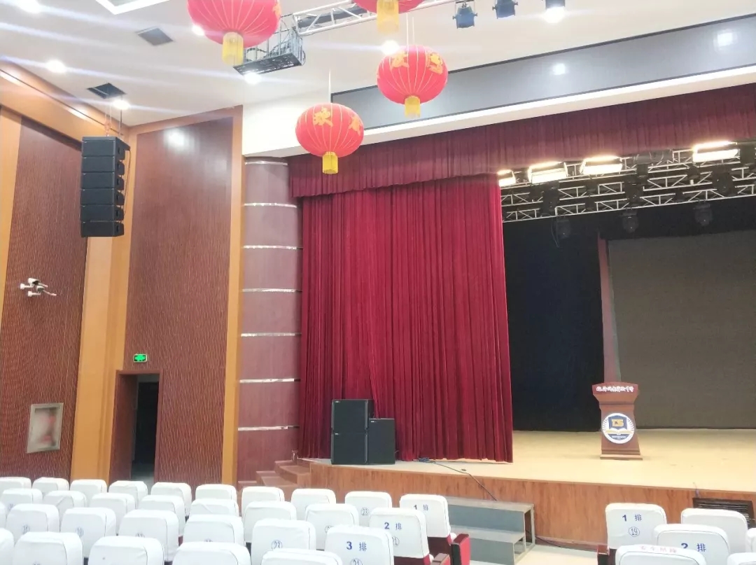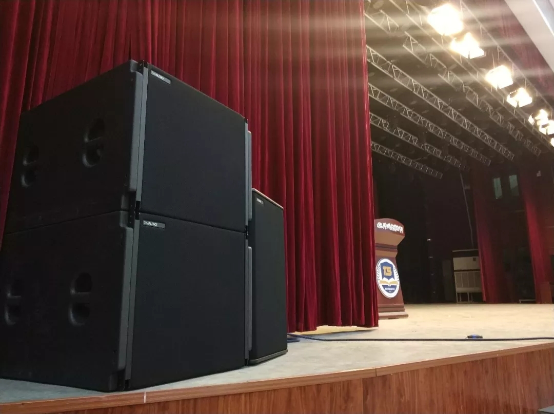 近日,为满足教学需求,新建成的文化艺术活动中学扩声系统选择了广州锐声的音频解决方案,选用了源自德国的TWAUDiO VERA20i 垂直线阵列系统。其中在舞台两侧吊挂了共 12只VERA20i 双10寸垂直线阵列扬声器,搭配 4只 S32 心形指向性超低音。除此之外还有2只M15,4只M12作为返送和补声全频扬声器。全部由K3DSP数字功放推动。