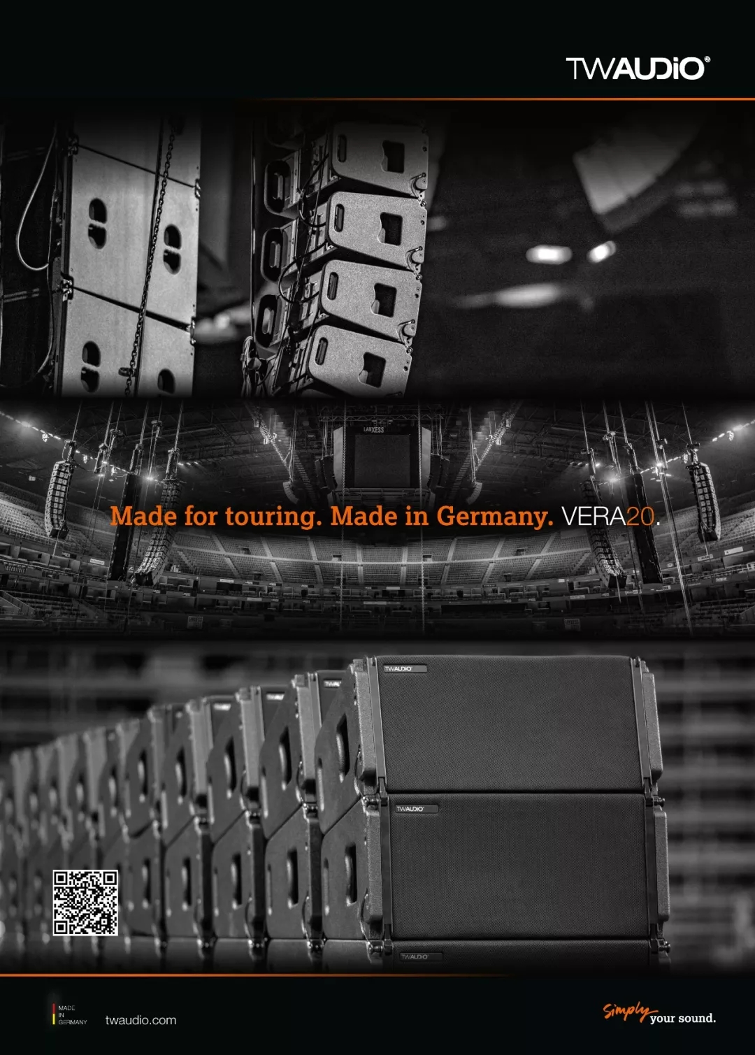 VERA20i全频音箱配置的是2个10寸低音扬声器和一个1.4寸带最新研发波导管的高音驱动器。尺寸仅有60cm宽,每串最多可吊挂24个。与典型的双8”系统相比,VERA20i的双10寸单元能够在中低频多输出6dB的能力,带有更低的失真。