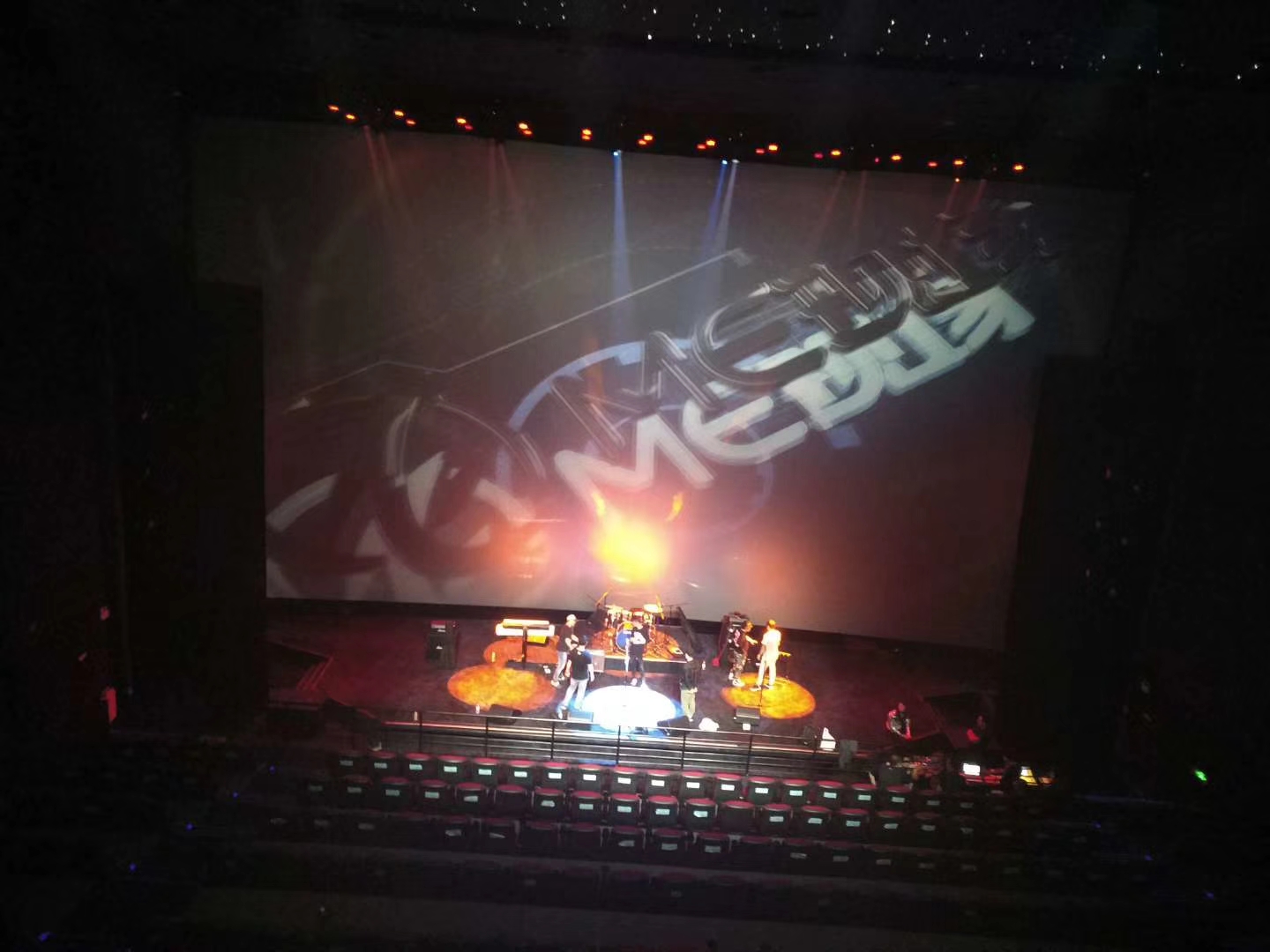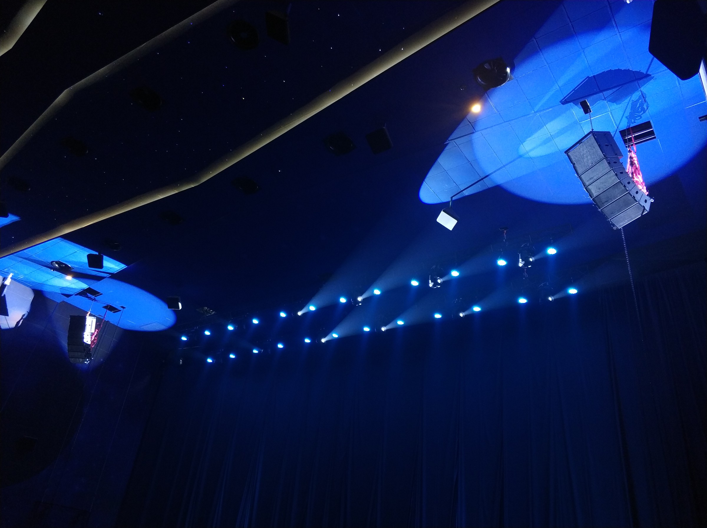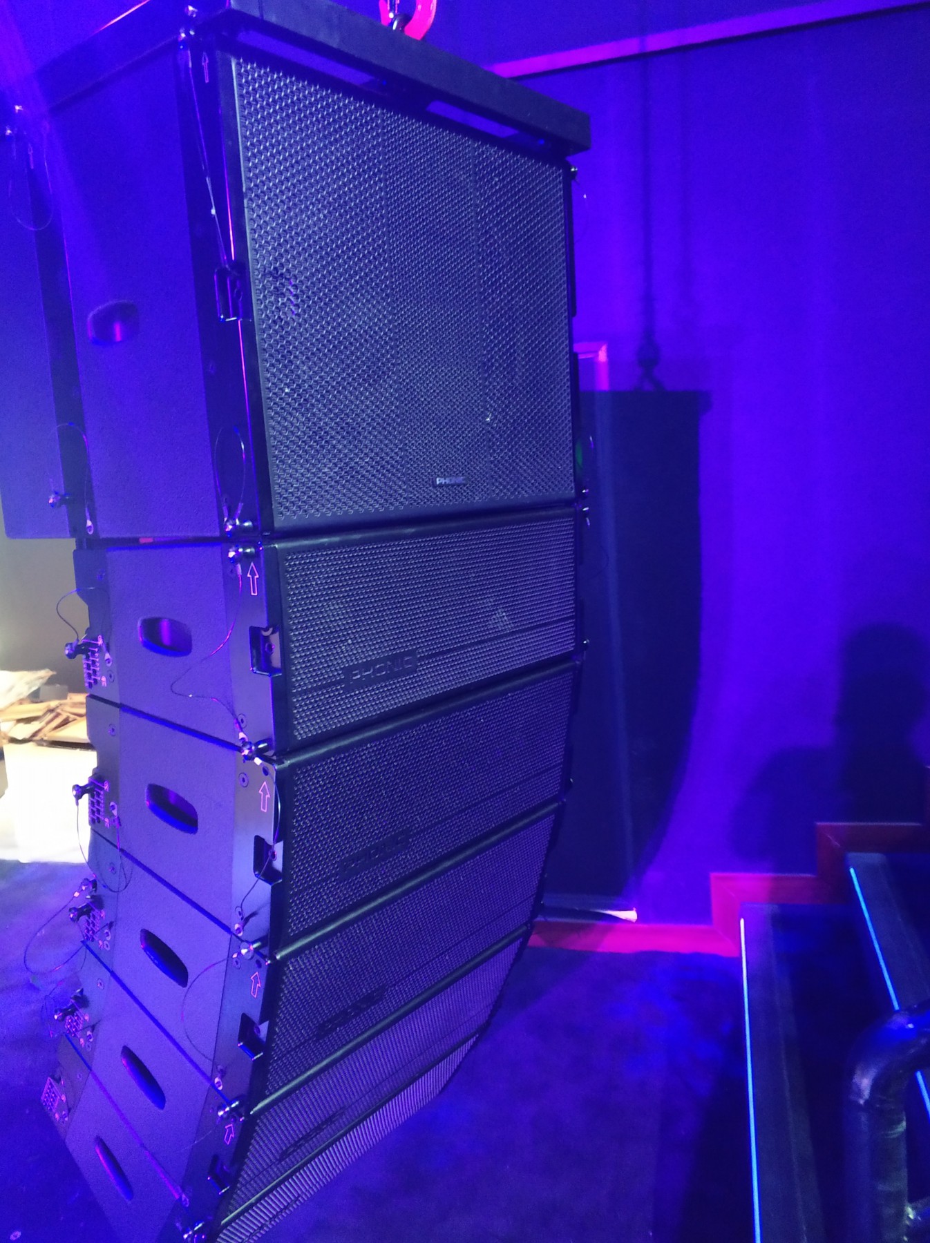 ”左右主扩声是合计10只的 8"线阵列全频扬声器KT-8,搭配2只18"无源阵列超低频扬声器KTS-18吊挂在舞台上方,2只双18寸低音TMS218B作为低音补充。6只Turbosound的TFX152M-AN有源全频扬声器作为返送。