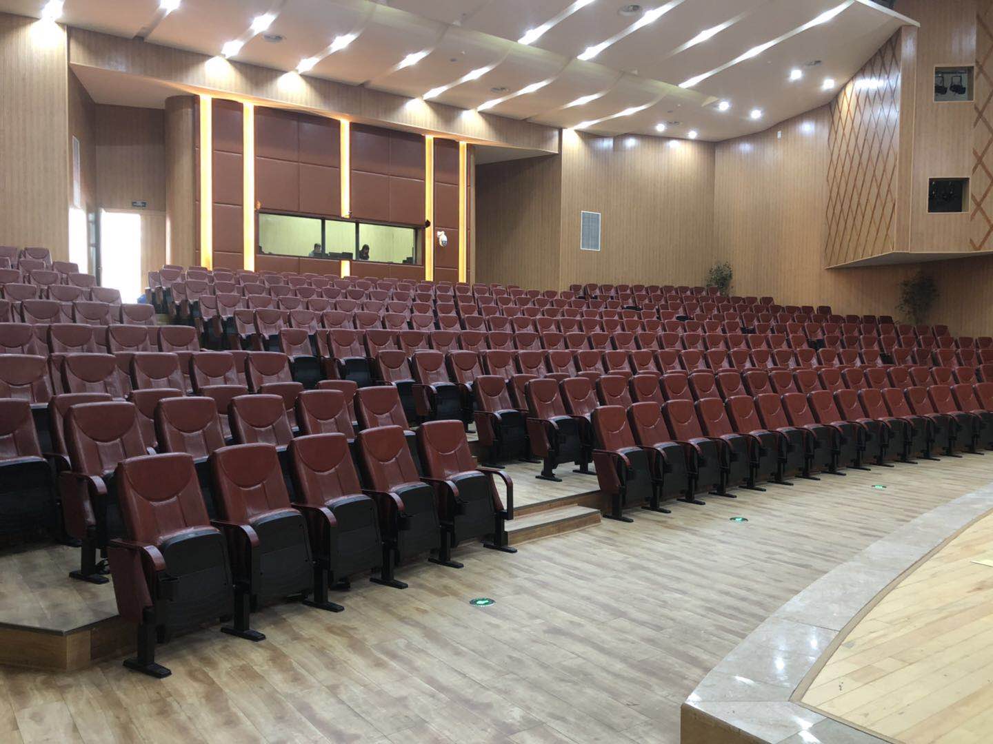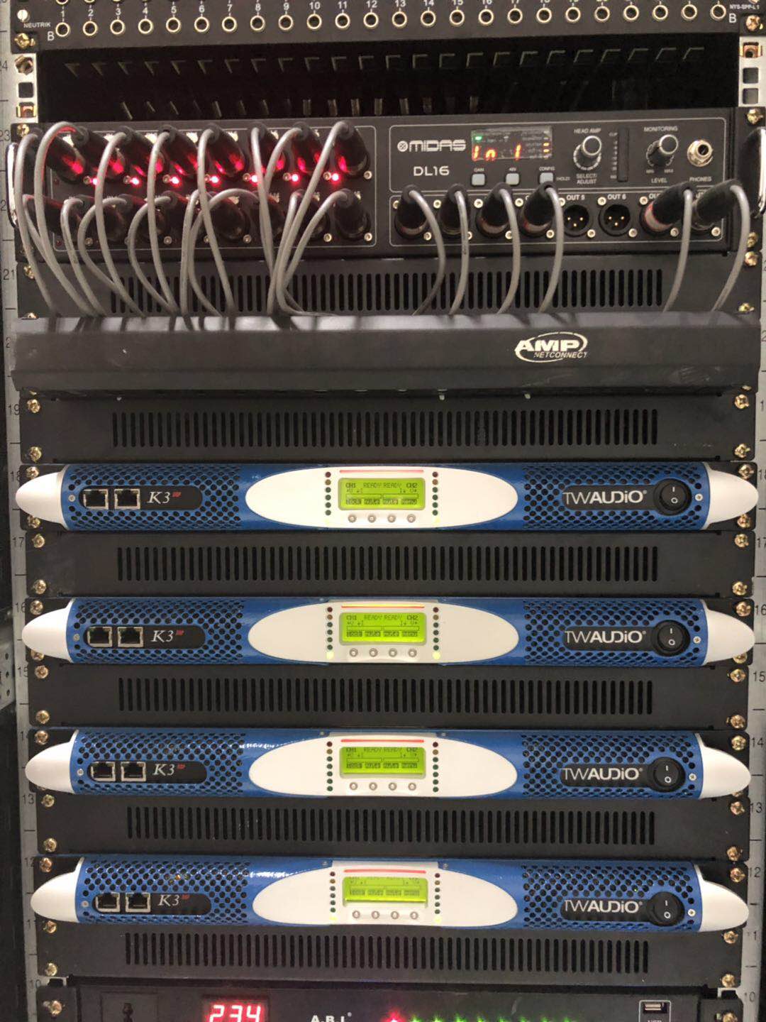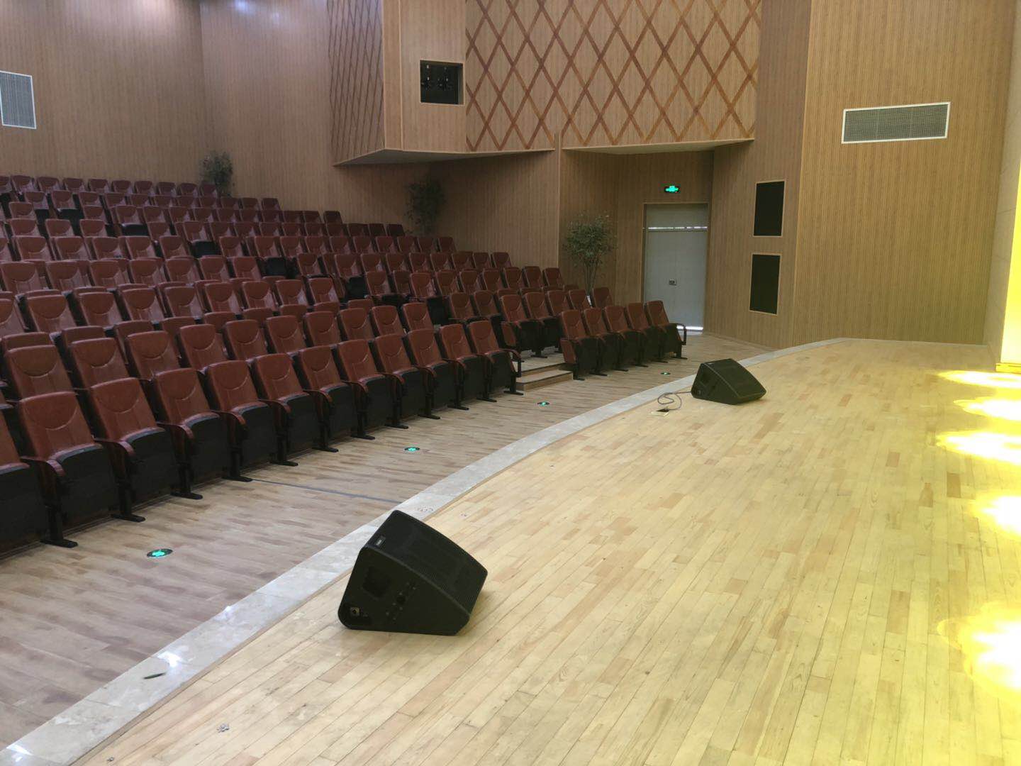 电子科技大学实验中学剧场主扩声系统采用6只90°的T20点声源线阵列扬声器打造,2只为一组分别吊挂在舞台两侧和舞台中央作为主扩声,2只M12全频音箱搭配2只B30超低放置在舞台两侧作为前补声以及低音补充,除此之外还有C12作为舞台监听。整套系统由4台K3DSP数字功放驱动。监控室内采用英国Midas M32数字调音台以及DL16舞台接口箱。