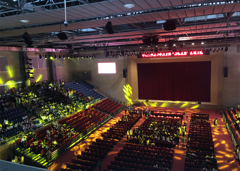 中山大学新华学院东莞校区体育馆舞台灯光系统由锐声旗下代理品牌产品V-light和筑梦DLW系列灯具打造。