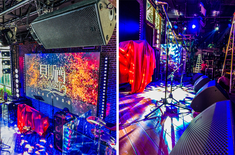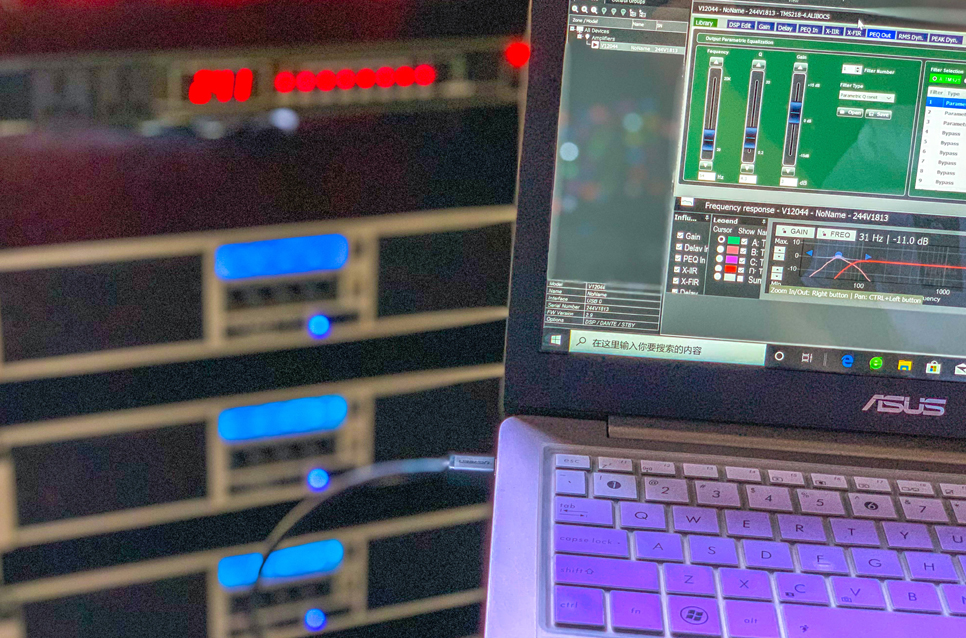 5只JBL PRX815W 15寸有源一体化智能扬声器作为舞台监听, 8只SAL的A6全频扬声器根据声场覆盖,均匀布置在餐吧各区区域。DJ监听耳机使用AKG K240 MKII。整套系统由4台西班牙RAMaudio V12044带dante版本的功放驱动。