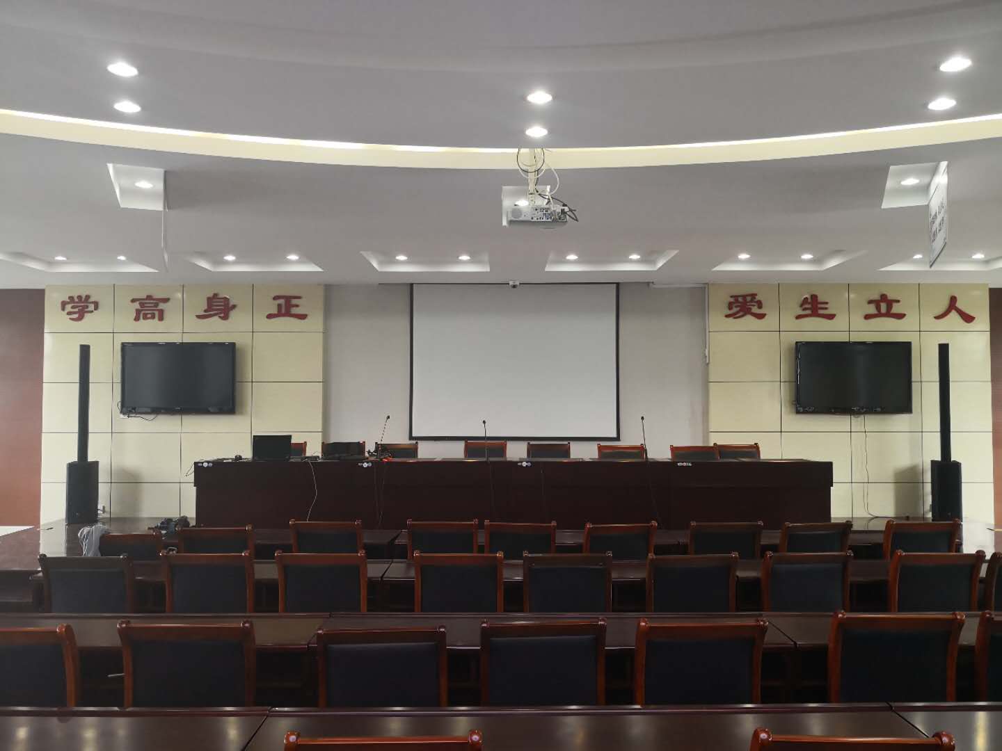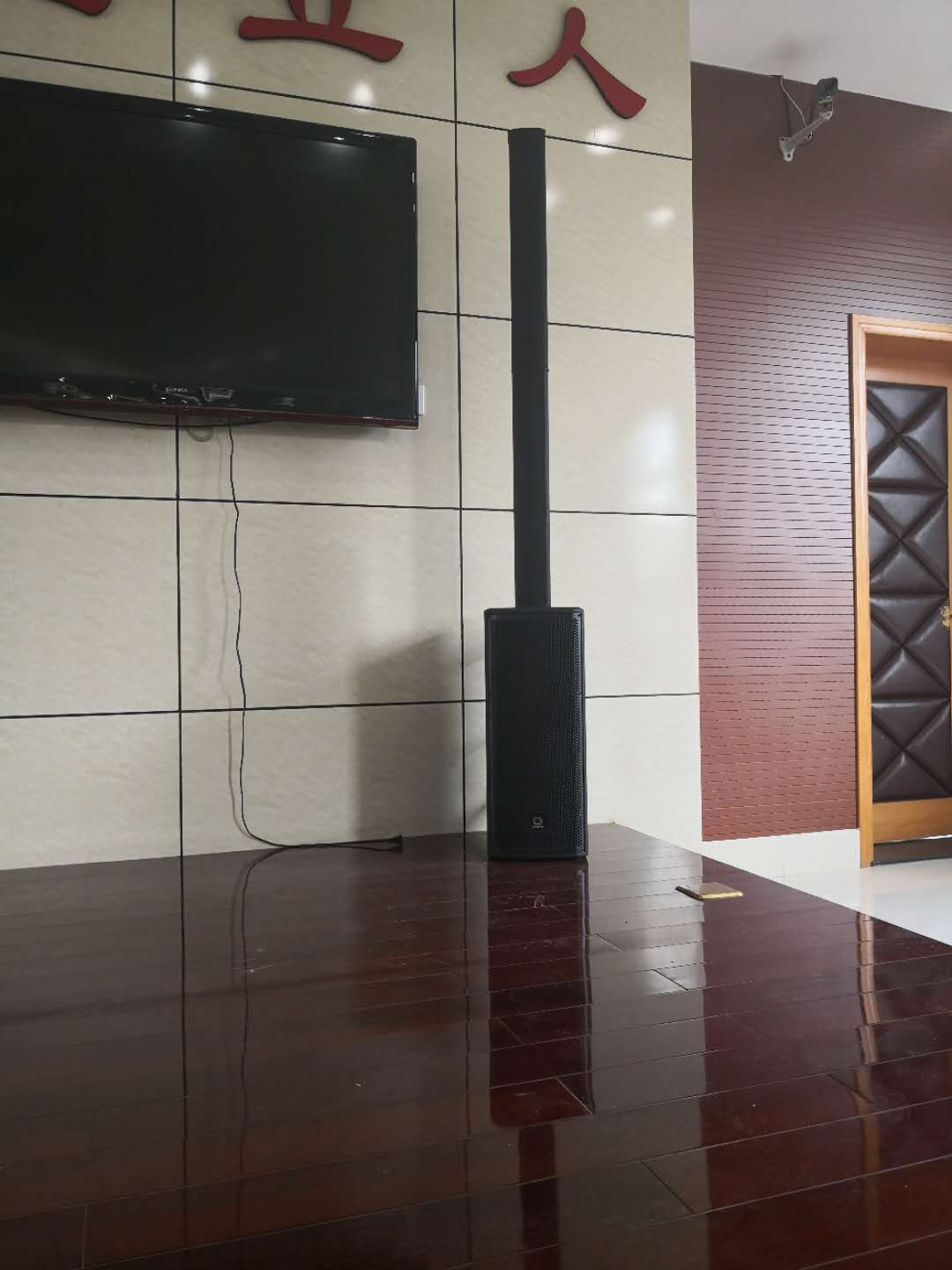 会议室中应用了2只iNSPIRE系列智能有源线阵列扬声器iP1000。摆放在舞台上的左右两侧作主扩音响。iP82作现场的辅助扩声。iNSPIRE系列智能化有源扬声器系统,小巧线条型的箱体设计,可以提供强大和高品质的声音,这是一个令人惊奇和方便实用的智能化有源扬声器产品。得益于搭载的三通道数字调音台和多通道的D类高传输距离号角,使得该系列很适合小到中型的表演场合,礼堂,会议室演讲等其他场合。