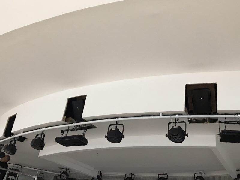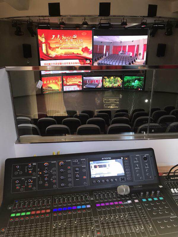 其中主扩采用2只15寸全频PRX815W壁挂在主舞台LED屏幕左右两侧,用于覆盖剧场主要区域。另外两只12寸全频PRX812W放置在舞台上,用于舞台返送。除此之外剧场四周根据声学建设使用了9只control28-1/control25-1 作为辅助补声,调音台是英国Midas 明星产品M32数字调音台.