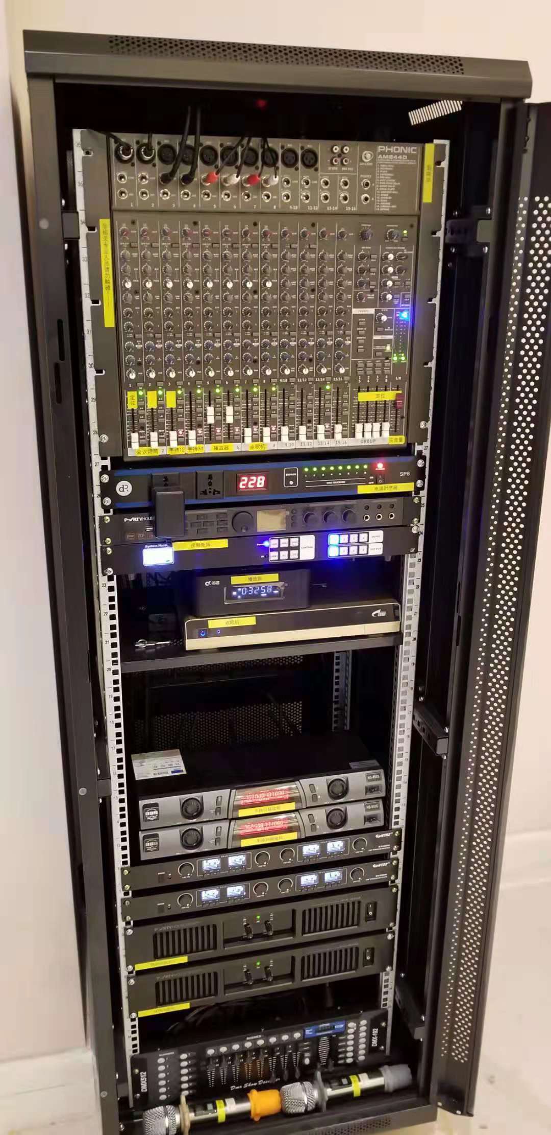 除此之外,现场还应用了众多锐声旗下代理产品如:美国PHONIC AM844D多功能模拟调音台,DIGIRESEARCH(DR) SP8电源时序器,台湾 JTS 9001无线话筒等数字化产品。
