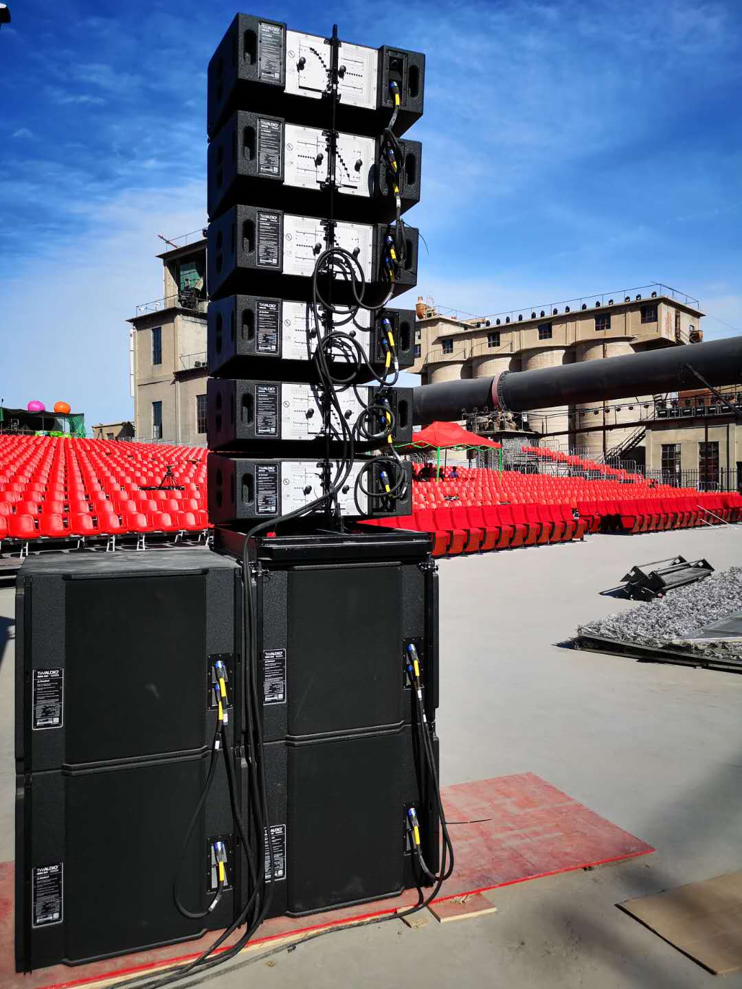 扩声系统使用了12只TWAUDiO VERA36垂直线阵列搭配8只VERA S33心型指向性超低音的组合作为主扩,4只T24N前补声全频扬声器、8只M12返听全频扬声器,功放采用7台PLM 12K44 数字DSP功率放大器。