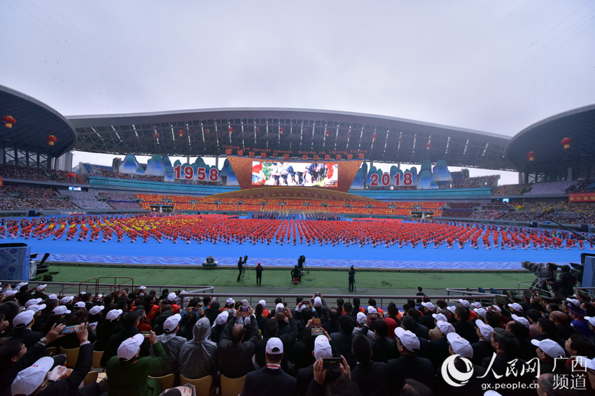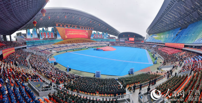 12月10日的南宁花团锦簇、喜气盈城,处处洋溢着欢乐喜庆的节日气氛。约2.2万名身着盛装的各族各界干部群众,欢聚在广西体育中心,共同庆祝盛大的日子。主席台上方,用壮、汉两种文字书写着“广西壮族自治区成立60周年庆祝大会”横幅。表达了各族人民的共同心声。“建设壮美广西共圆复兴梦想”12个大字高悬,两侧“1958”“2018”字样格外醒目。
