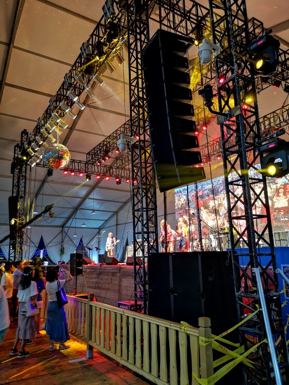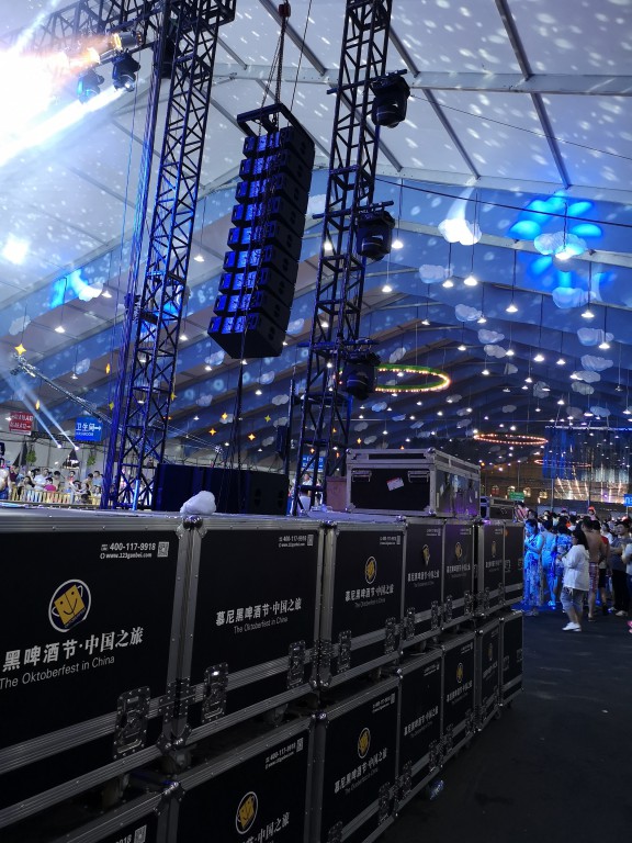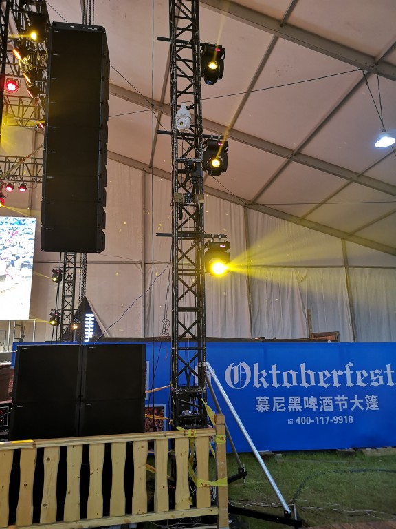 本届啤酒节的现场扩声系统依旧采用来自由广州锐声旗下代理品牌德国TWAUDiO垂直线性阵列扬声器系统,应用18只Vera36垂直线性阵列音箱,12只S33超低,12只M12作为返听,整个系统由17台K3DSP功放驱动;还用了奥地利AKG DMS800参考级数字无线话筒和PHONIC PAA6音频分析仪 ,英国Midas PRO1&PRO2数字调音台等。