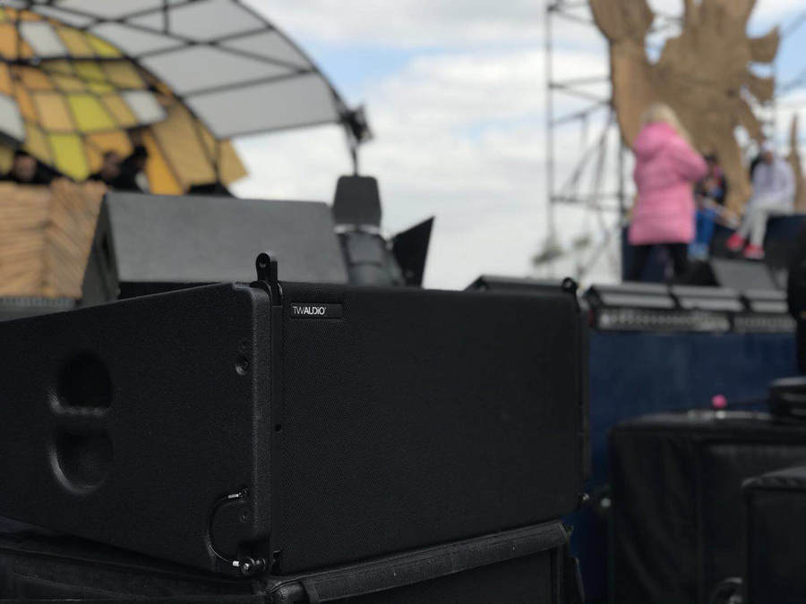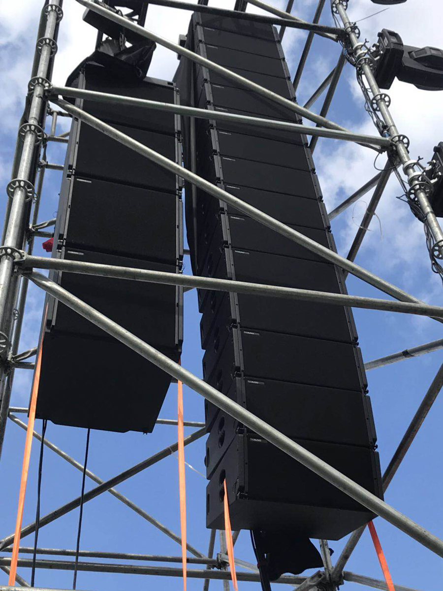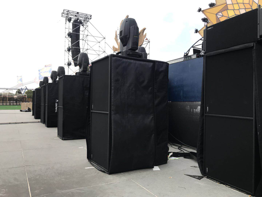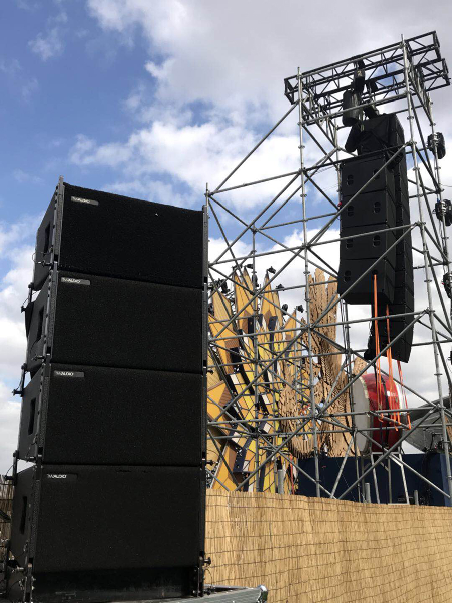 2017科罗娜日落声起音乐节——上海站,音响系统大升级,为满足成千上万的观众一起感受日落声起音乐节的魅力,主办方在音响系统上选择了更多的德国 TWAUDiO扬声器。其中包括在舞台两侧左右各吊挂着15只Vera36+4只S33担任主扩,4只Vera 36担任前补声、一共使用12只双21寸超低音BSX以及4只Vera 10 作为外补音,当然还有与之配套的K3DSP数字功放。