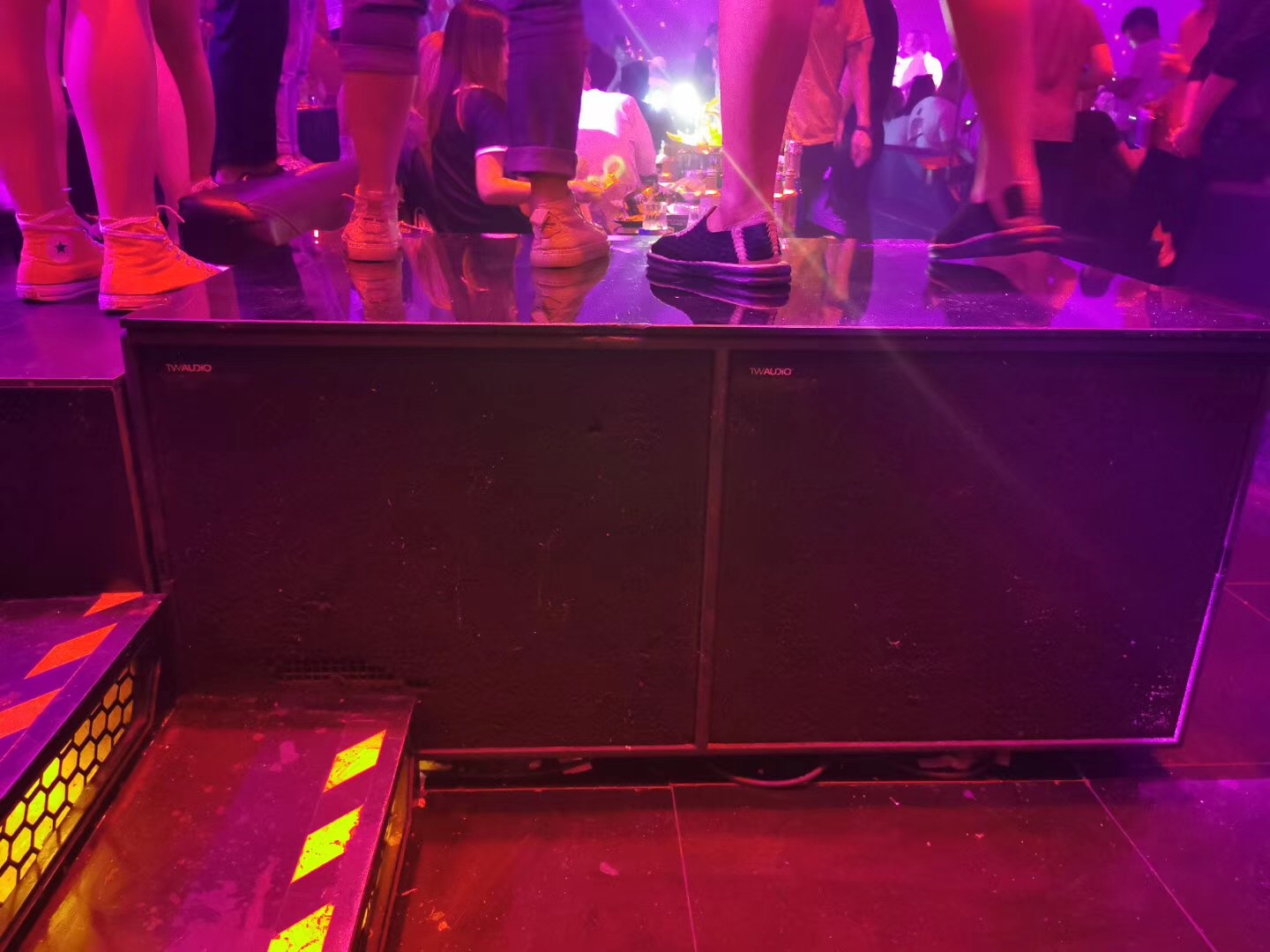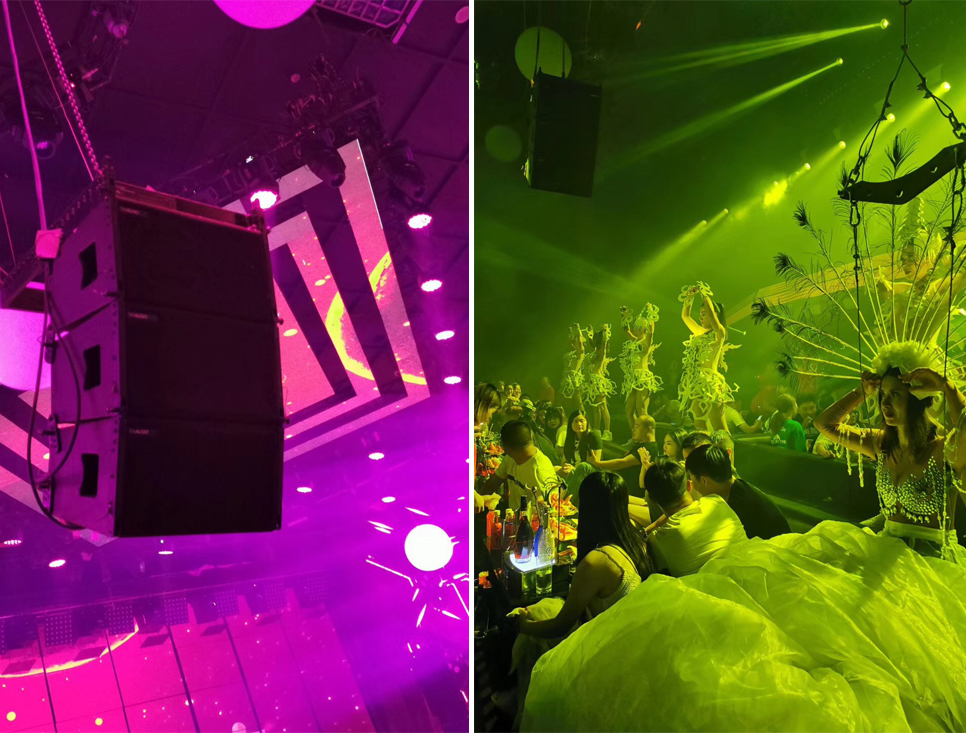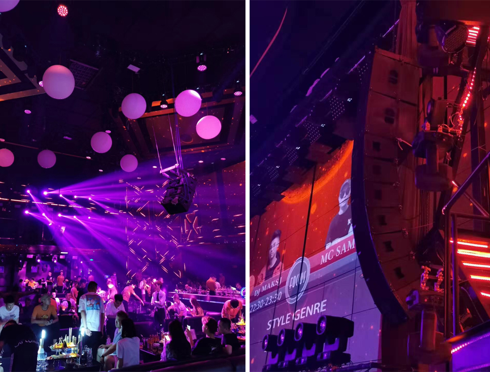 新伊莎国际派对空间主扩声系统采用德国TWAUDiO扬声器系统。其中在主舞台左右两边分别吊挂着2只L24搭配7只V10的垂直线阵列系统,侧补是3只为一组的V10,合计20只VERA10垂直线阵列和4只VERA L24中低频,8只B30超低音分别坐落在卡座之间, 还有4只BSX双21寸超低音为整个娱乐场所提供了强劲有力得低音补充。