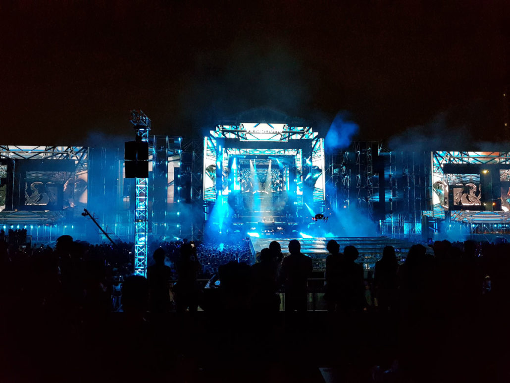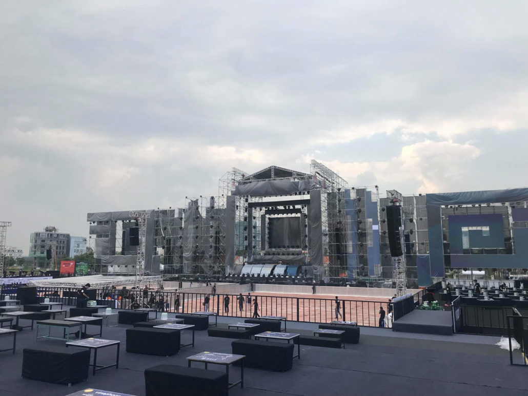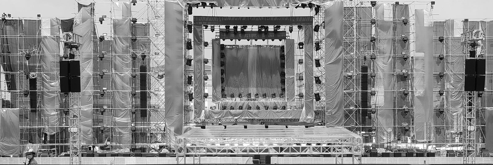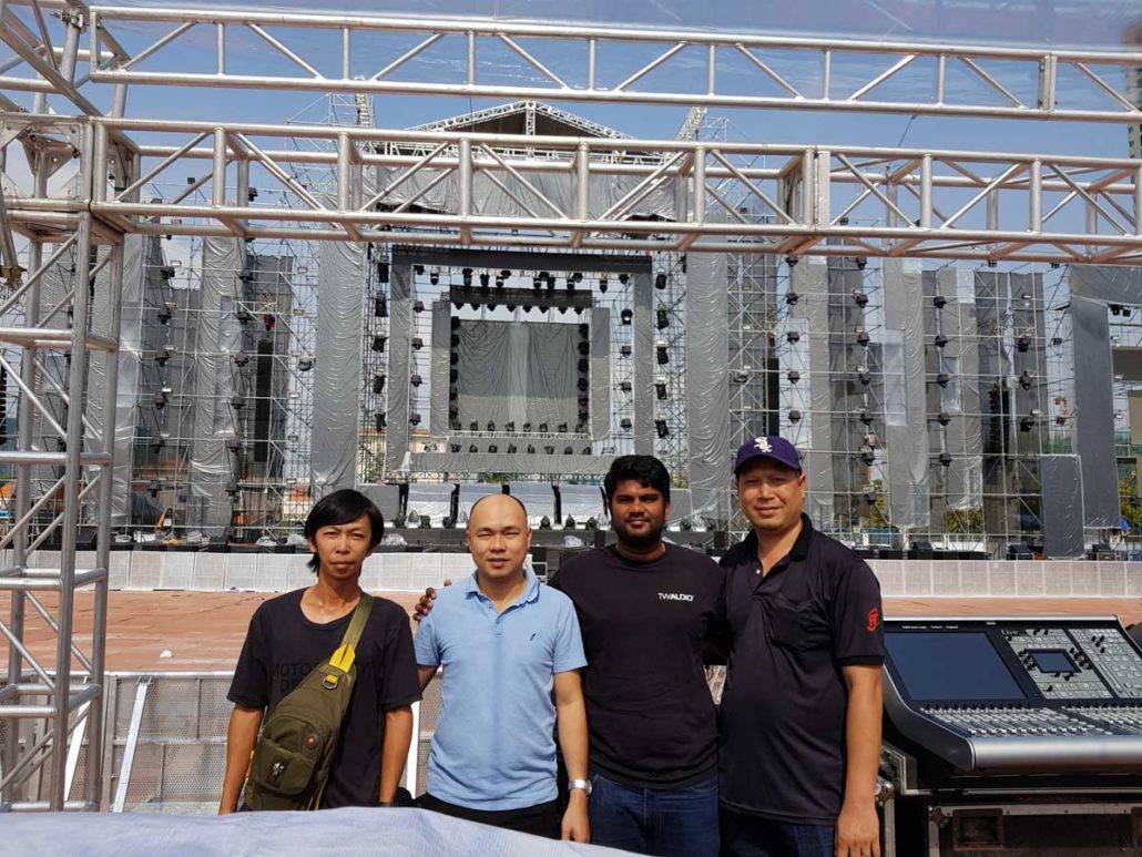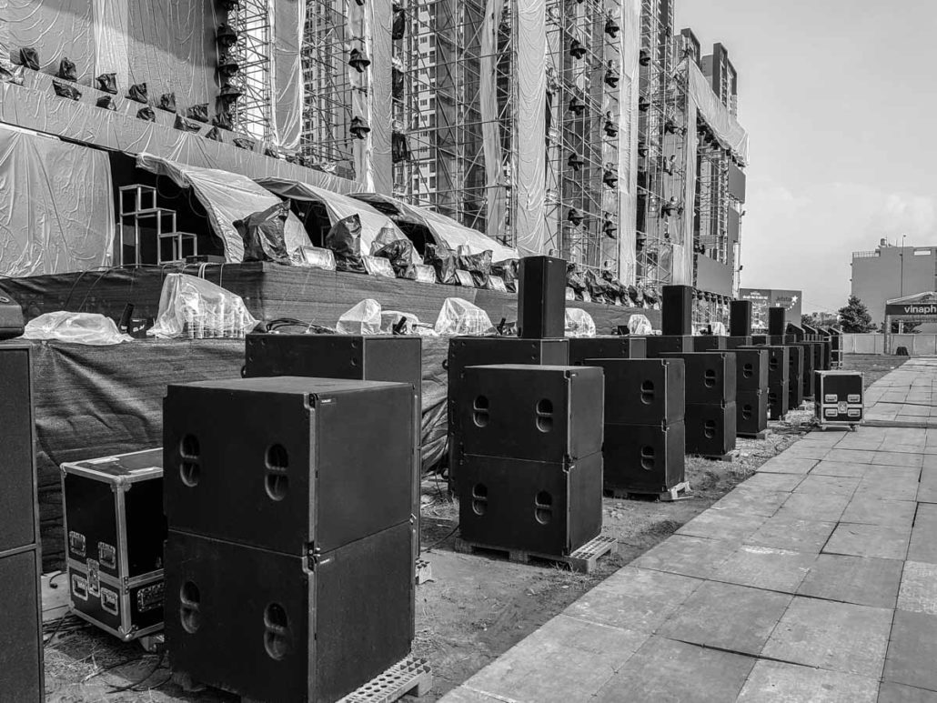 本场演出左右两侧主扩声是每侧18只的VERA36三分频线阵列,侧补声是12只VERA36,舞台左右有两个VIP区域各由6只VERA36和4只BSX、8只B18低音覆盖,主扩声超低由21只BSX和20个S33组成,低音阵列在舞台下方一字排开。