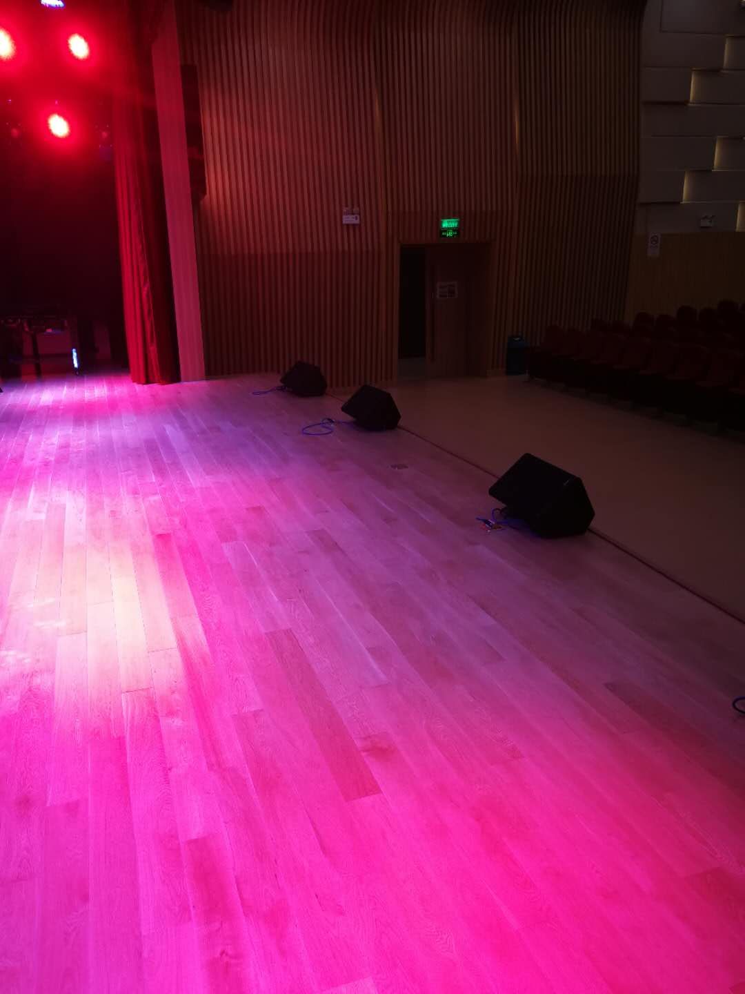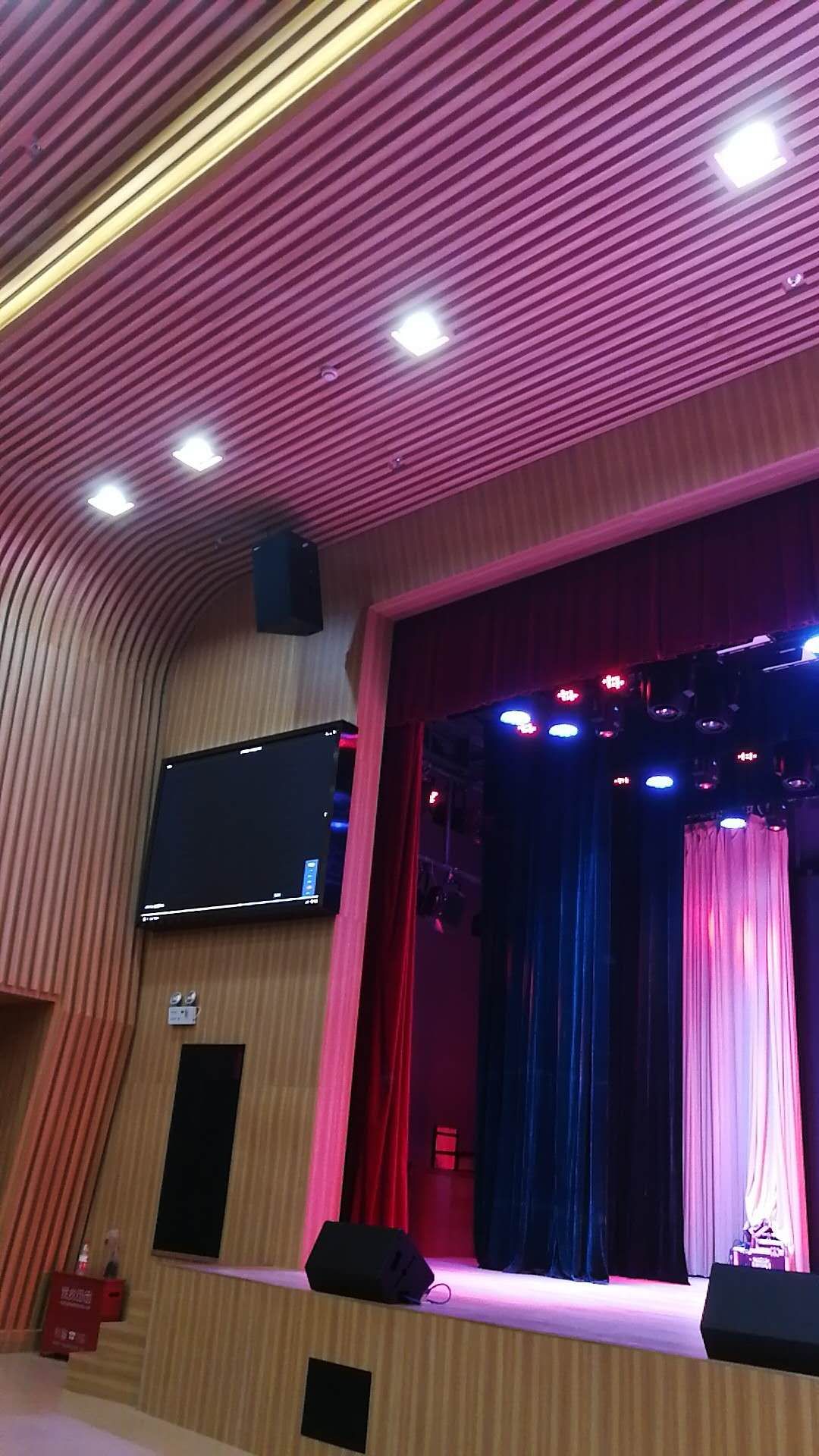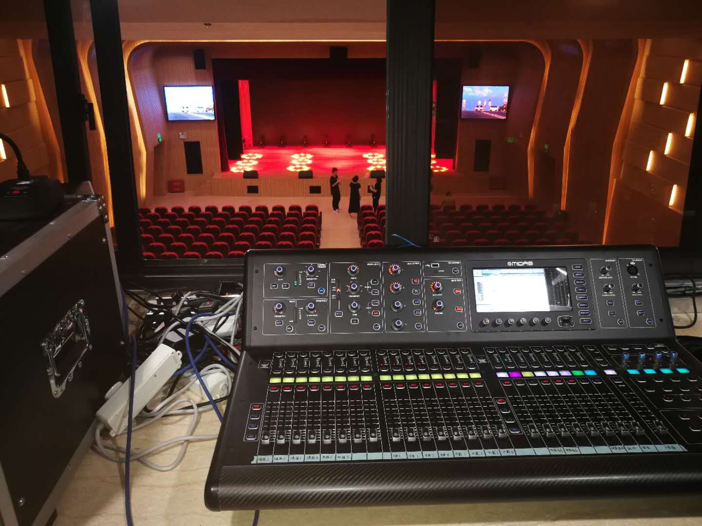 剧场舞台上的主扩声系统由德国TWAUiO的点声源音响T24N以及B18低音音箱担任,M12作舞台监听,除此之外还有C5、T20等产品均被应用。整套扩声系统使用K3DSP数字功放驱动。在监控室内,调音台方面选用英国的Midas M32数字调音台搭配DL16舞台接口箱。PHONIC 的ACUMEN 6A也被应用作为监听。还有其他PHONIC产品如:IW6510高保真天花板喇叭,ICON300功放等。 无线话筒方面采用的是奥地利AKG DMS800系列,分别使用4套双通道DSR800参考级数字无线固定接收机、DHT800 无线手持发射机搭配2套D5 WL1专业动圈音头,2套C535 WL1参考级电容音头。为满足剧场的文娱演出活动,还配备了DPT800参考级数字无线腰包发射机,4副LC82 MD 轻质参考级全指向领夹麦克风,4副EC81MD 轻质参考级心型指向耳挂式麦克风,SRA2 B/EW有源指向性宽频带UHF天线等多款数字化产品。