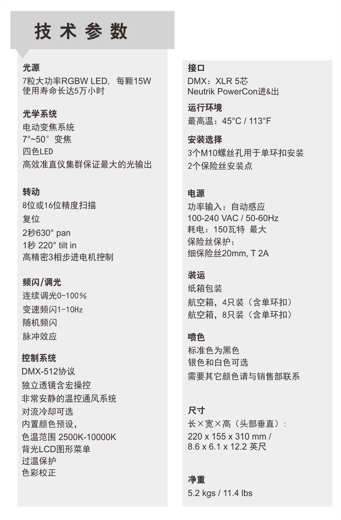 Impression X4S 配备7颗大功率RGBW LEDS,每颗15W,7 °- 50 °变焦。使用与X4相同的光学系统,X4S还沿袭了X4的一些特点,如小角度时提供非常清晰的光束效果,而大角度时则提供均匀且柔和的染色效果。X4S因为体积更小,重量更轻,在16 bit控制下,它的pan & tilt运转速度非常之快。