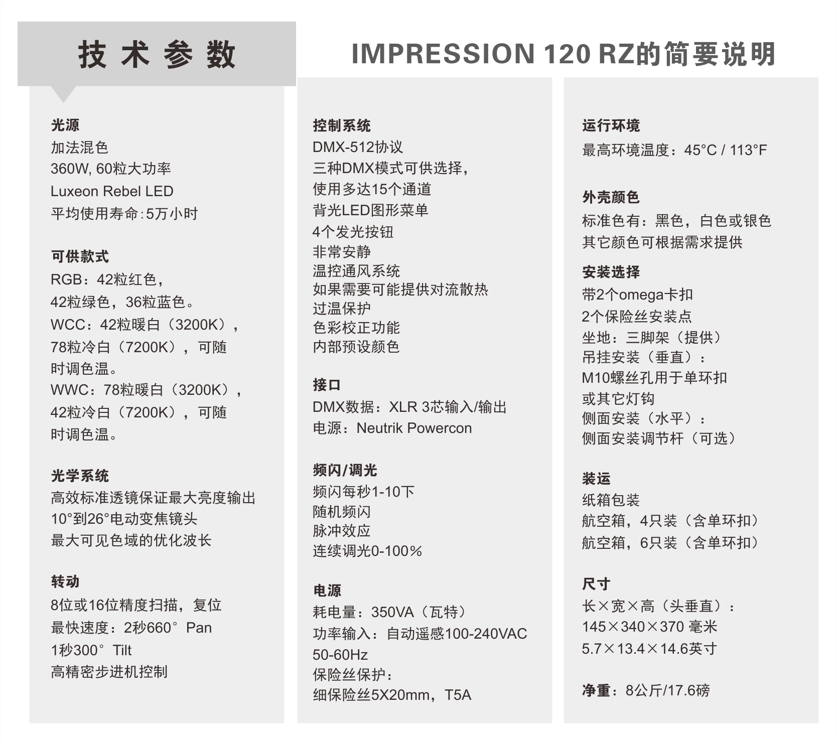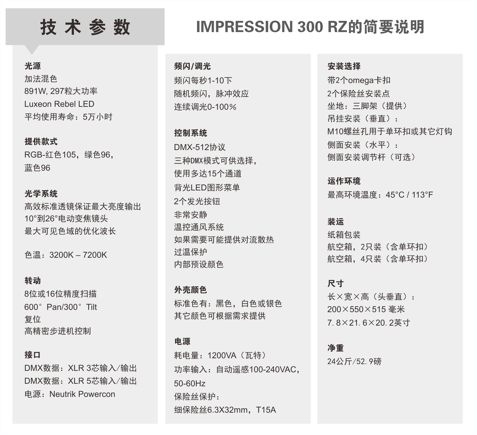 Impression 300 RZ的设计十分精致,无底座,重量更轻,更容易吊挂安装或者坐立在地板上。散热系统的独特结构可散发任何多余产生的热量,使300 RZ即使在全功率运行时也能保持耳语般的安静。虽然300RZ可以完美地与其它Impression灯,包括小号灯混合使用,其灵活度主要还是在于有变焦功能。