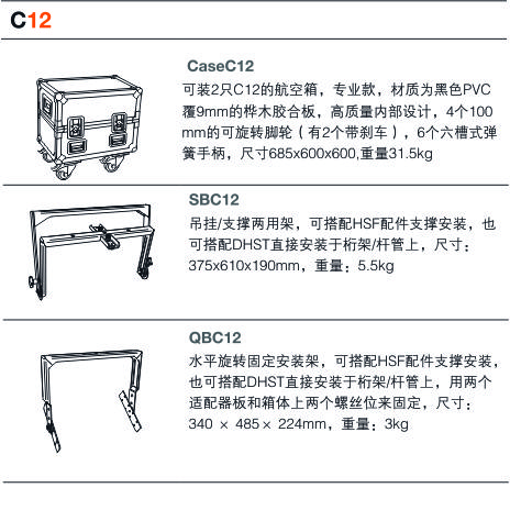 相对低的中高音分频点使得人声更加有穿透力。同样的效果在普通的标准功放驱动中也能达到,不需要额外的修正器和昂贵的处理器。将C12和C15一起使用也是完全可以的,他们只是在低频的相位响应上有一点点不同。所以C12适合用于把紧凑小巧作为首要要求的场合,而C15更适合对低音要求更多的场合。箱体的设计与宽大的低音反射通道的尺寸相协调,使得低音非常结实有力,直接跟地面接触,给你切实的冲击感。