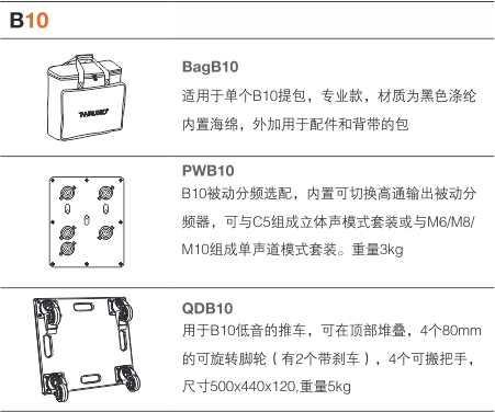 新开发的带一个3寸双音圈的超长冲程锥盆驱动(long excursion cone driver)和带可切换高通输出的分频器(可选)。使系统能在标准的主动分频模式及多种其他被动模式之间转换。例如, 立体声模式中,单只B10与2只C5搭配,2只B10转化成单声道模式,各搭配一只M8或4只B10加2只M10。以上所有的组合变化均可用一台标准的双通道功放驱动。