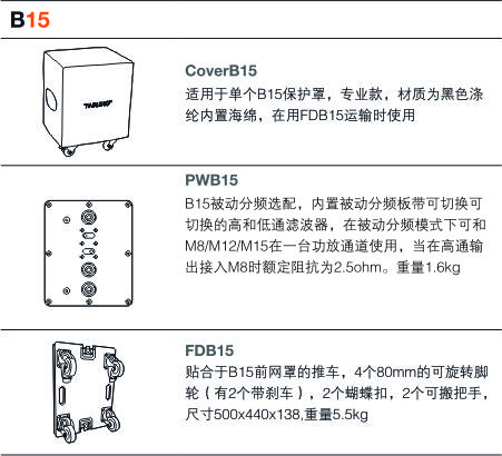 可选项 PWB15内置分频板,主动/被动模式可选 可切换至高输出8ohm卫星音箱 RAL 颜色可选