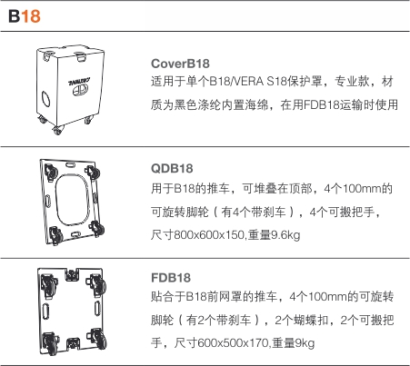 单元类型 1 × 18" 频率范围(±3dB) 32 - 160 Hz 功率(节目/ 峰值) 2400 / 4800 W 阻抗 8 Ω 灵敏度 1 W / 1 m 96 dB 最大声压级 132 dB 接口 NL4 2± REAR, NL4 2± FRONT 尺寸 (高×宽×深) 606×500×800 mm 重量 42.6 kg 涂层 Warnex 结构漆 配件 FDB18, QDB18, CoverB18 可选 RAL colours