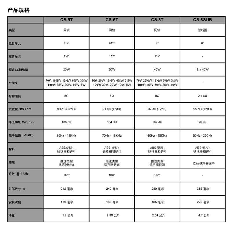 CS系列是高保真的吸顶式扬声器,可在商业和私人环境中提供多种操作应用。驱动器尺寸从5½”到8” CS系列具有多种功率处理和声压级,由四个优质,轻便的扬声器组成即使是最苛刻的场地也可以轻松安装。 具有25至40瓦的功率处理,这些是分立的。扬声器适用于中高和高的天花板安装,例如学校,体育馆,会议室,购物中心和零售店。多种工作模式(8欧姆,70V和100V)使它们几乎适用于任何安装。 双线圈CS-8SUB可与任何同轴扬声器完美匹配为你的音乐增添一点额外的低音。 非常适合背景音频系统和通话系统CS系列几乎可以集成到任何天花板材料中。