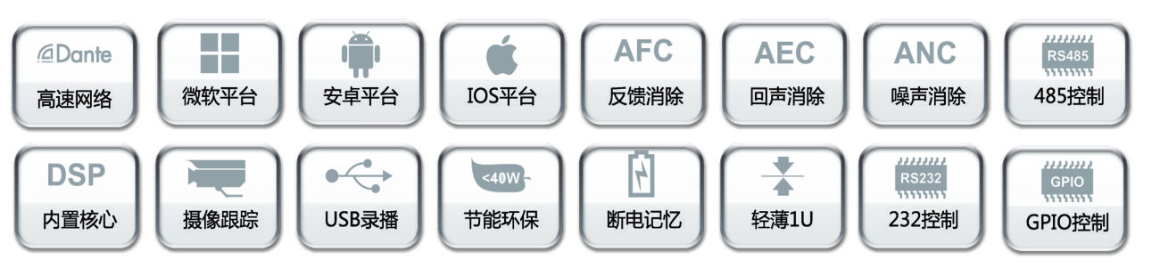 DSP音频处理,内置自动混音台,带AFC反馈抑制功能和AEC回声消除